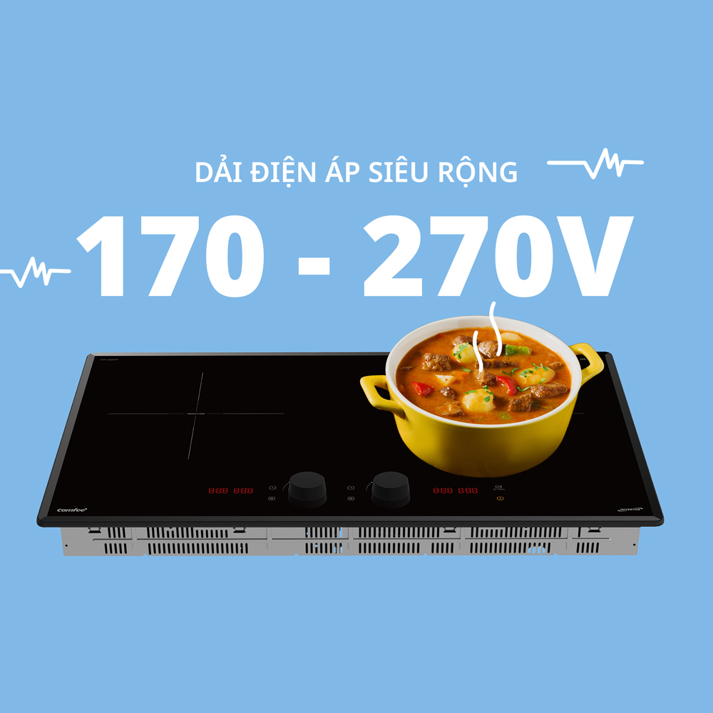 Dải điện áp siêu rộng từ 170V - 270V cho phép Bếp từ 2 bếp thông minh COMFEE CIH-55DSU hoạt động ổn định trong thời điểm cao điểm tiêu thụ điện tại đô thị hoặc khi thiếu hụt nguồn cung cấp điện ở các vùng xa.
