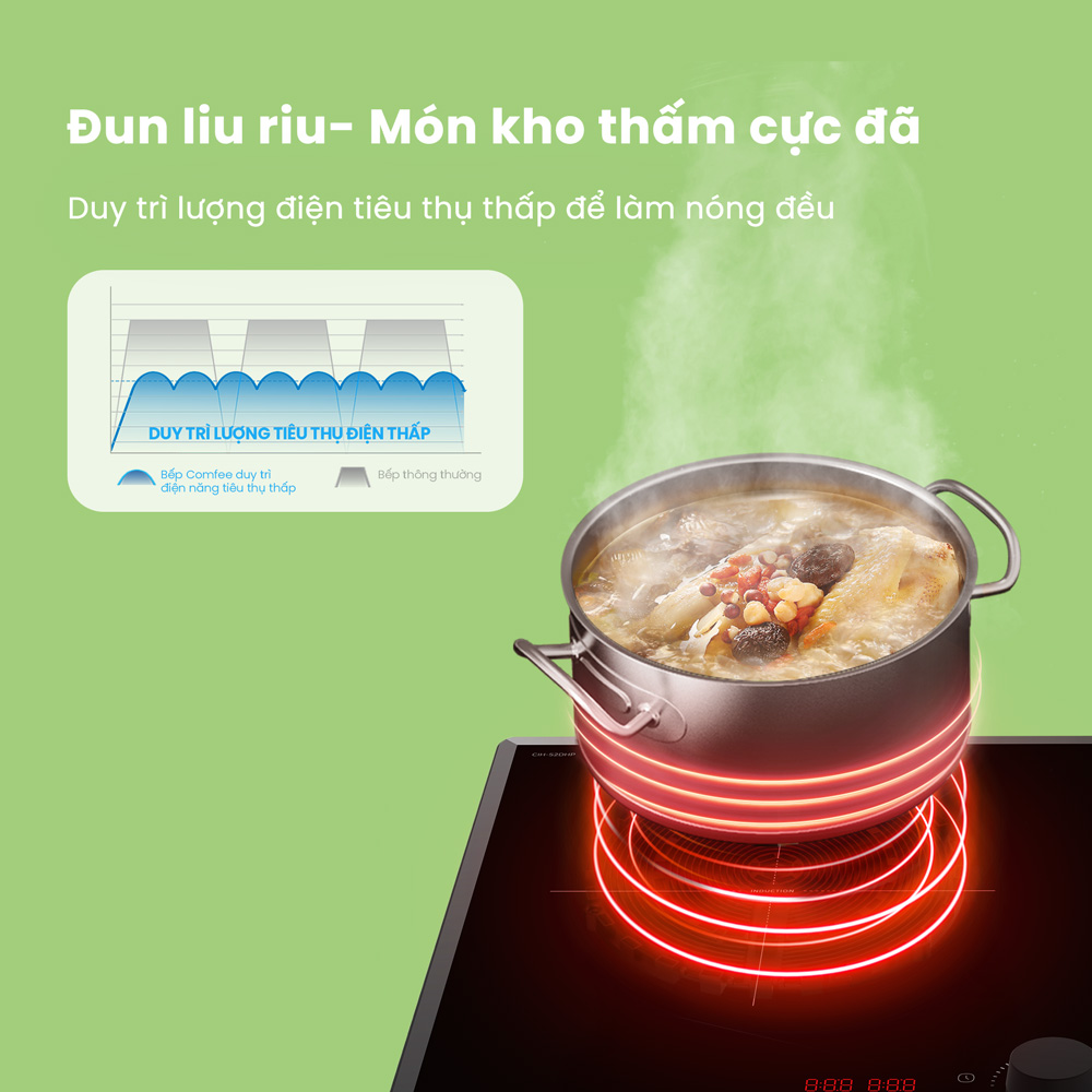 Khi nấu ở mức công suất thấp, Bếp từ 2 bếp thông minh COMFEE CIH-55DSU giúp duy trì nhiệt độ ổn định, làm cho các món hầm và kho trở nên mềm mịn, thấm gia vị và đậm đà hơn.