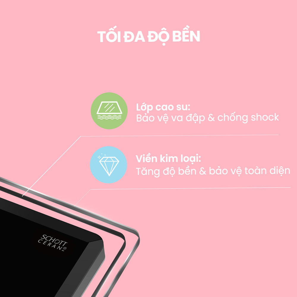 Mặt kính Schott Ceran có khả năng chịu nhiệt lên đến 800*C và chịu lực lên đến 150kg, mang lại độ bền vượt trội, khả năng chống trầy xước và an toàn tuyệt đối.