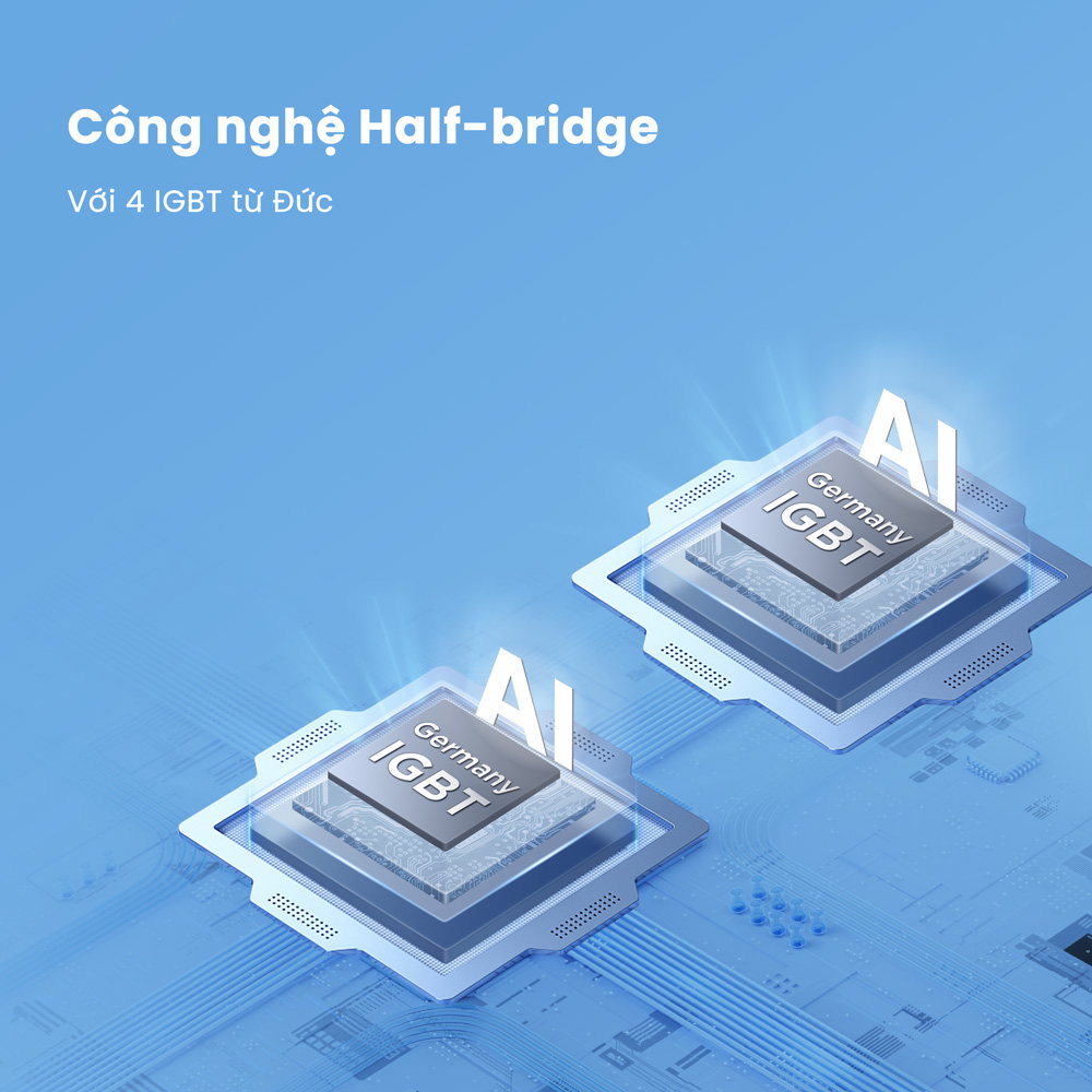 Công nghệ Halfbridge là công nghệ tiên tiến nhất của bếp từ, giúp kiểm soát chủ động dòng điện hiệu quả, tối ưu hóa hiệu suất của mâm nấu, mang đến cho bạn trải nghiệm nấu ăn nhanh chóng và tiết kiệm năng lượng. Và đặc biệt độ bền cao nhất so với các dòng bếp thông thường khác.