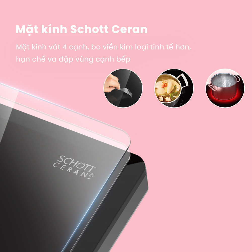 Với khả năng giữ độ trong suốt và bền đẹp qua thời gian, mặt kính vát 4 cạnh, bo viền kim loại tinh tế hơn, hạn chế va đập vùng cạnh bếp, mặt kính Schott là lựa chọn hoàn hảo cho những ai yêu thích sự kết hợp giữa bền bỉ mà hài hòa về thẩm mỹ trong không gian bếp.