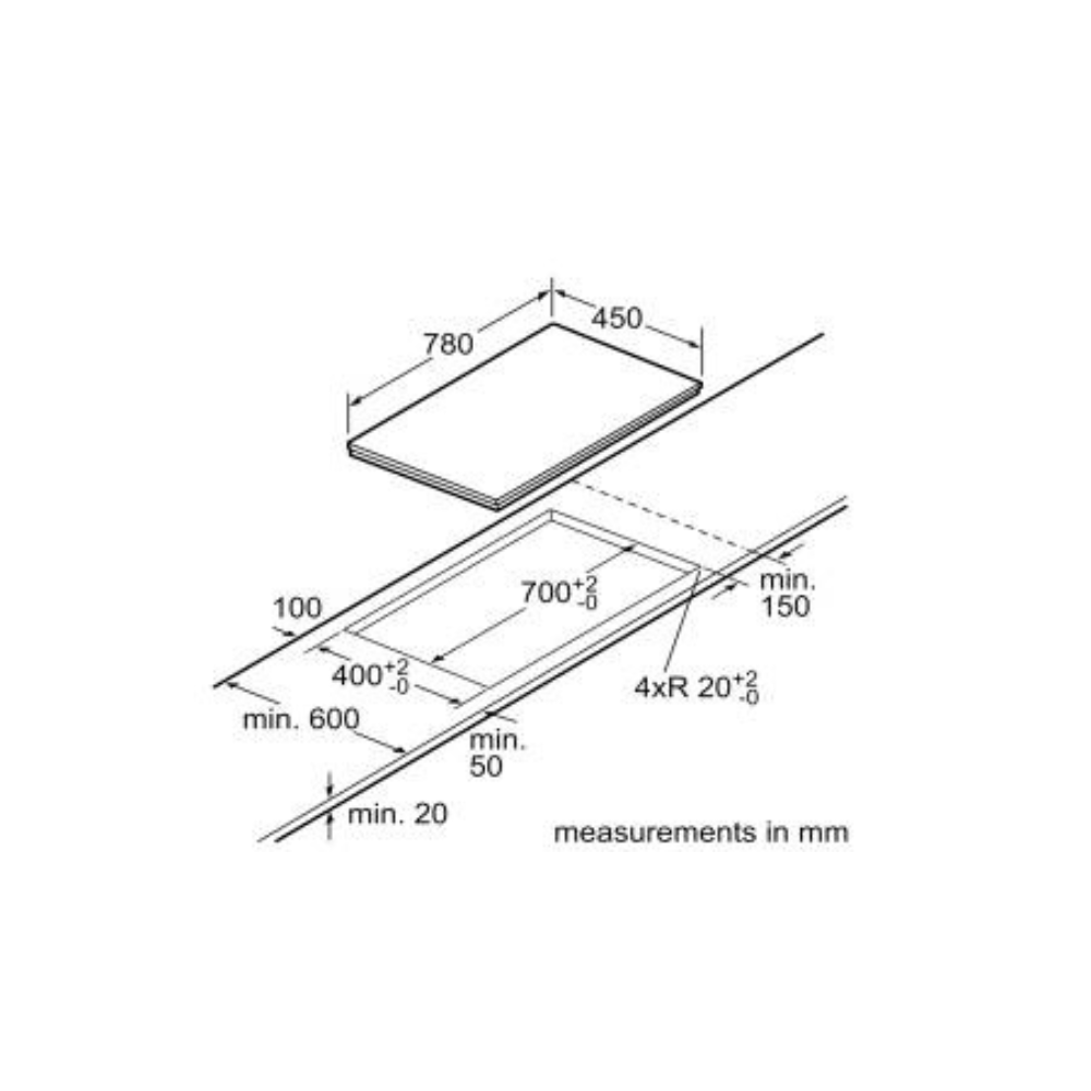 - Mặt gốm thủy tinh Schott, vát 2 cạnh trước và sau, viền inox 2 cạnh bên và phía dưới.