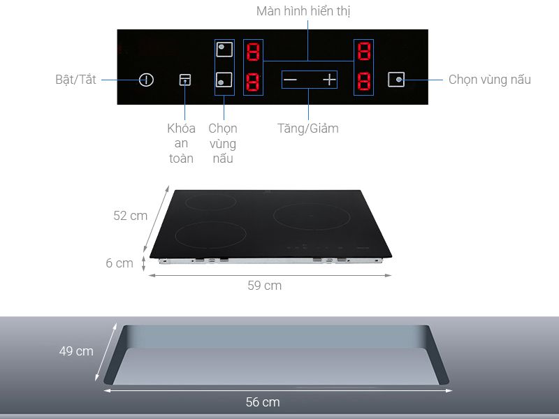 Lưu ý: bếp phù hợp với nồi/chảo có đường kính đáy 14.5 – 18 cm (vùng trái dưới), 12.5 – 14.5 cm (vùng trái trên), 18 – 21 cm (vùng phải).