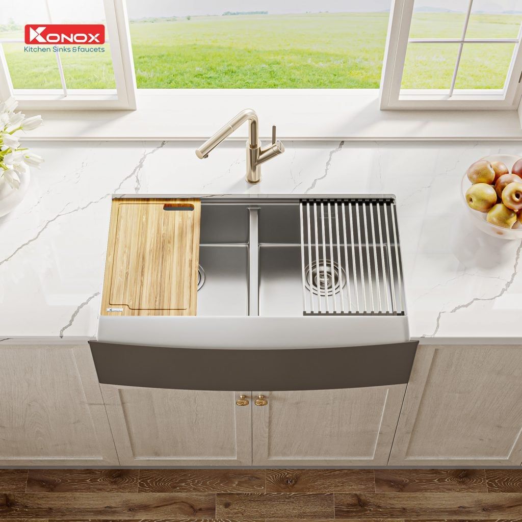 Workstation – Apron Sinks (hay còn gọi Farmhouse Sinks) – dòng sản phẩm được Konox lấy cảm hứng, phát triển từ căn bếp nông trại nơi miền quê yên bình của Pháp, Ý, Anh,…- gian bếp là trái tim của ngôi nhà phong cách đồng quê.