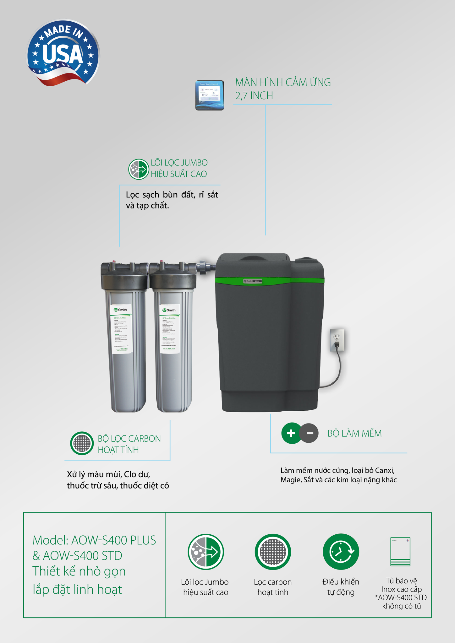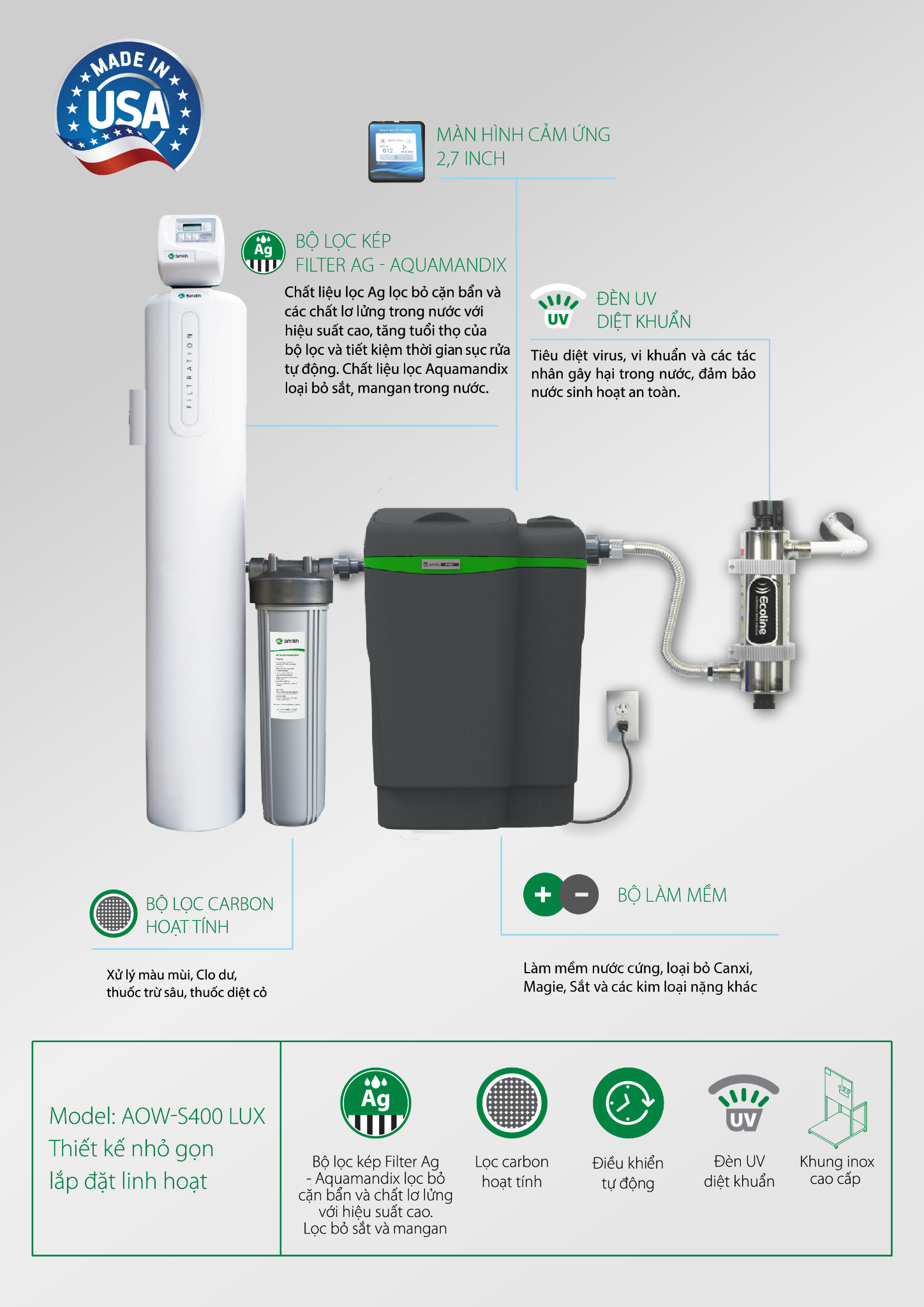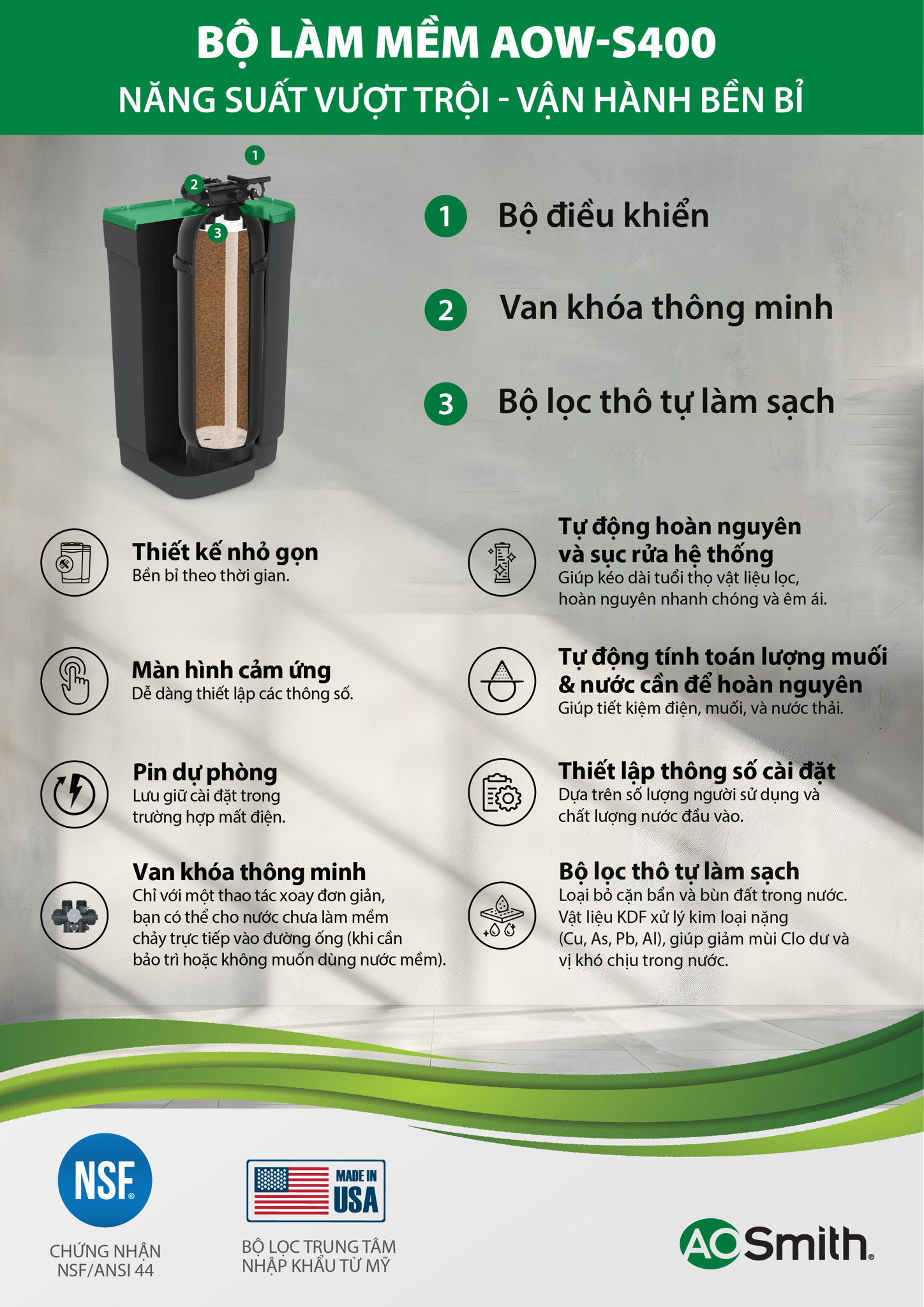 Bộ làm mềm nhập khẩu từ Mỹ, được chứng nhận bởi tổ chức NSF International theo tiêu chuẩn. NSF/ANSI 44 (Standard 44) của Hoa Kỳ, giúp loại bỏ phần lớn Canxi, Magie, bảo vệ các thiết bị vệ sinh và các thiết bị như máy giặt, bình nước nóng…