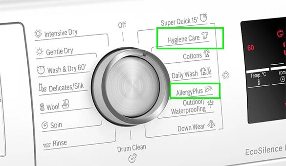 - AllergyPlus – loại bỏ đến 99,99% vi khuẩn và các tác nhân gây dị ứng. Sử dụng mức nhiệt 60-65°C và phù hợp khử khuẩn các loại khăn tắm, ga trải giường hay vỏ gối.