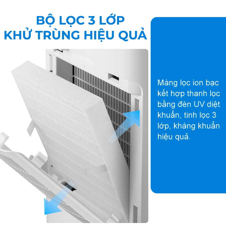 - Khử khuẩn hiệu quả với bộ lọc 3 lớp, màng lọc UVC giúp cải thiện chất lượng không khí