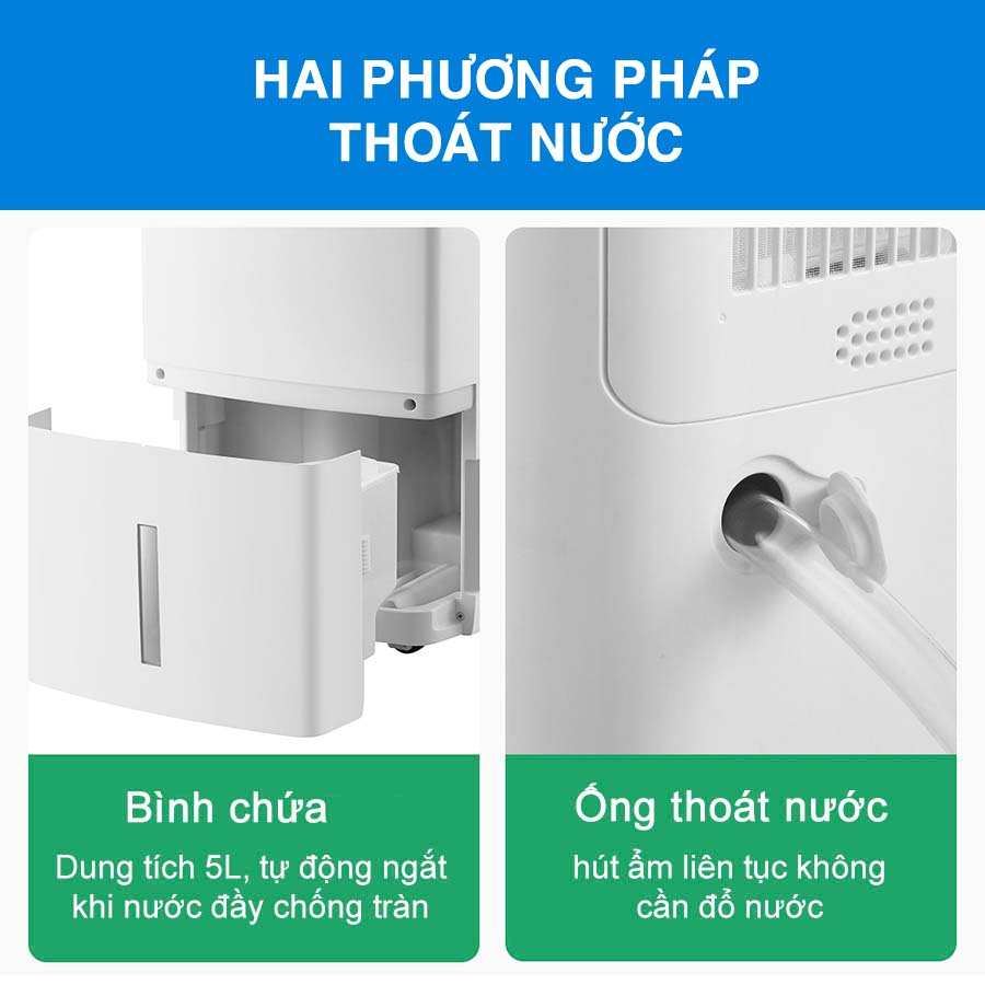 Hoặc là bạn có thể sử dụng ống thoát nước để hút ẩm liên tục mà không cần đổ nước thường xuyên. Điều này giúp giảm bớt công việc quản lý máy và đảm bảo tính tiện lợi trong việc sử dụng.