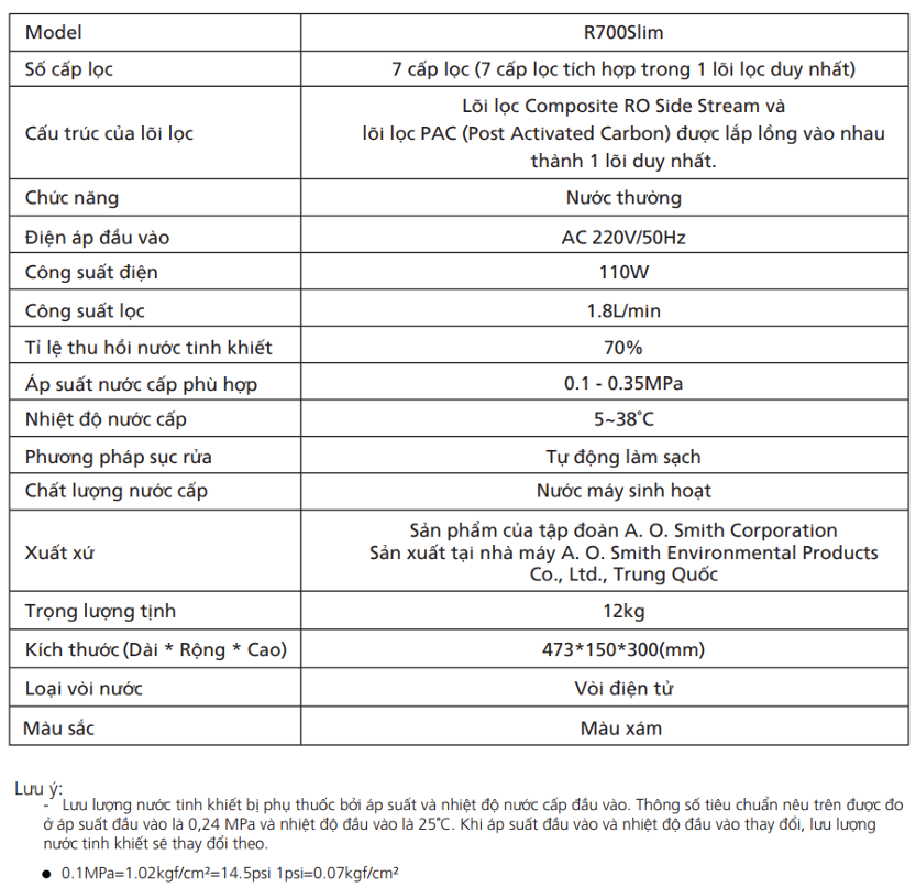 Máy lọc nước A.O.Smith công suất lớn R700 Slim