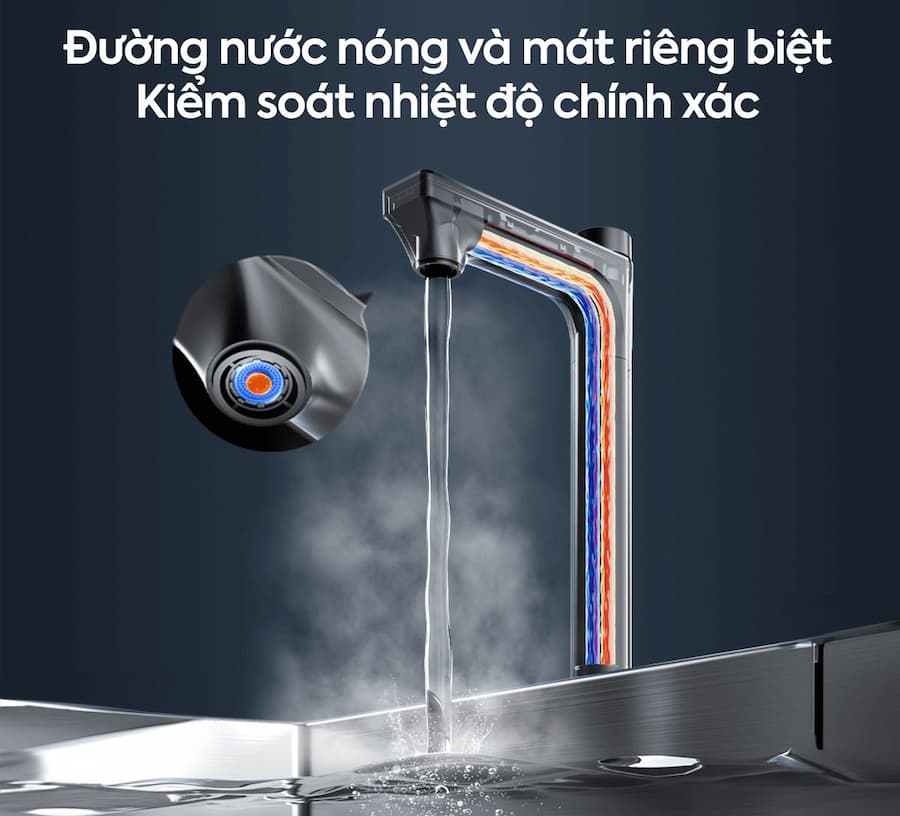 Tốc độ lọc siêu tốc: 2,5 lít/phút (): Tốc độ lọc cao nhất trong phân khúc, cung cấp nước sạch nóng/lạnh tức thì, không gây gián đoạn.