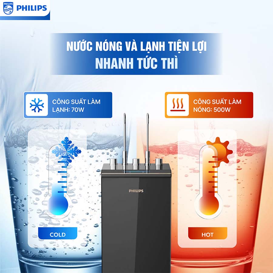 Máy lọc nước Philips không chỉ đảm bảo nguồn nước tinh khiết nhờ công nghệ lọc tiên tiến mà còn tích hợp chức năng cung cấp nước nóng và lạnh, đáp ứng linh hoạt nhu cầu sử dụng trong gia đình và văn phòng.