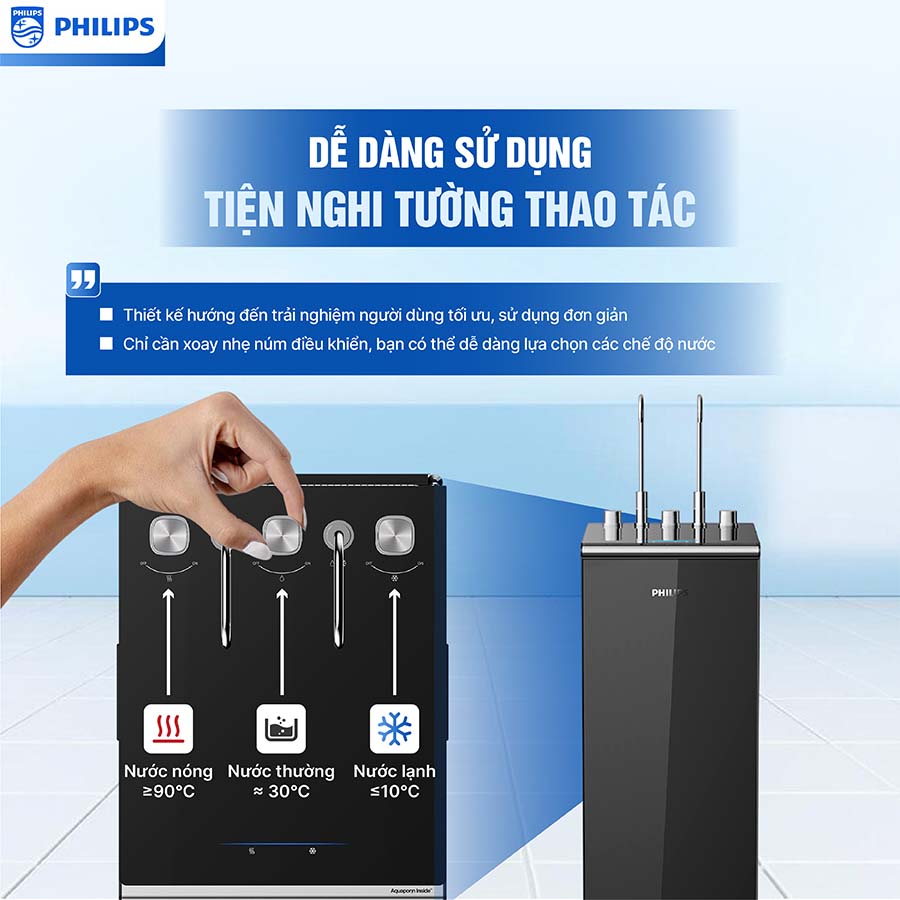 Máy lọc nước RO Philips ADD8922 được thiết kế hướng đến trải nghiệm người dùng tối ưu, giúp việc sử dụng trở nên đơn giản và thuận tiện nhất cho mọi đối tượng trong gia đình. Chỉ với thao tác xoay nhẹ núm điều khiển, bạn có thể dễ dàng lựa chọn giữa nước lạnh, nước mát hoặc nước nóng, phù hợp với đa dạng nhu cầu như pha cà phê hòa tan, pha trà, nấu súp hay thưởng thức các loại đồ uống mát lạnh tức thì.