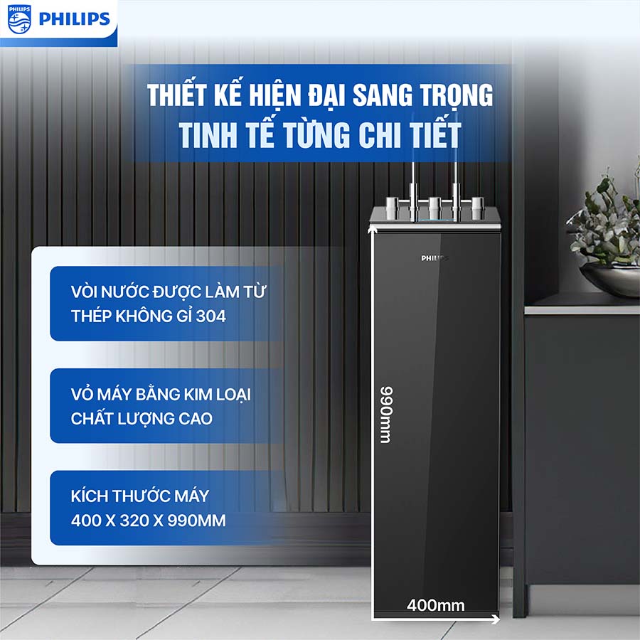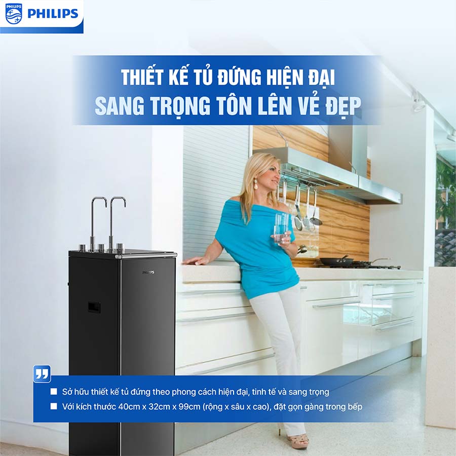 Máy lọc nước RO Philips ADD8922 sở hữu thiết kế tủ đứng theo phong cách hiện đại, tinh tế và sang trọng, phù hợp với không gian sống đẳng cấp. Với kích thước 40cm x 32cm x 99cm (rộng x sâu x cao), máy có thể đặt gọn gàng trong bếp, phòng khách hoặc văn phòng mà không chiếm quá nhiều diện tích, đồng thời trở thành điểm nhấn trang trí tinh tế.