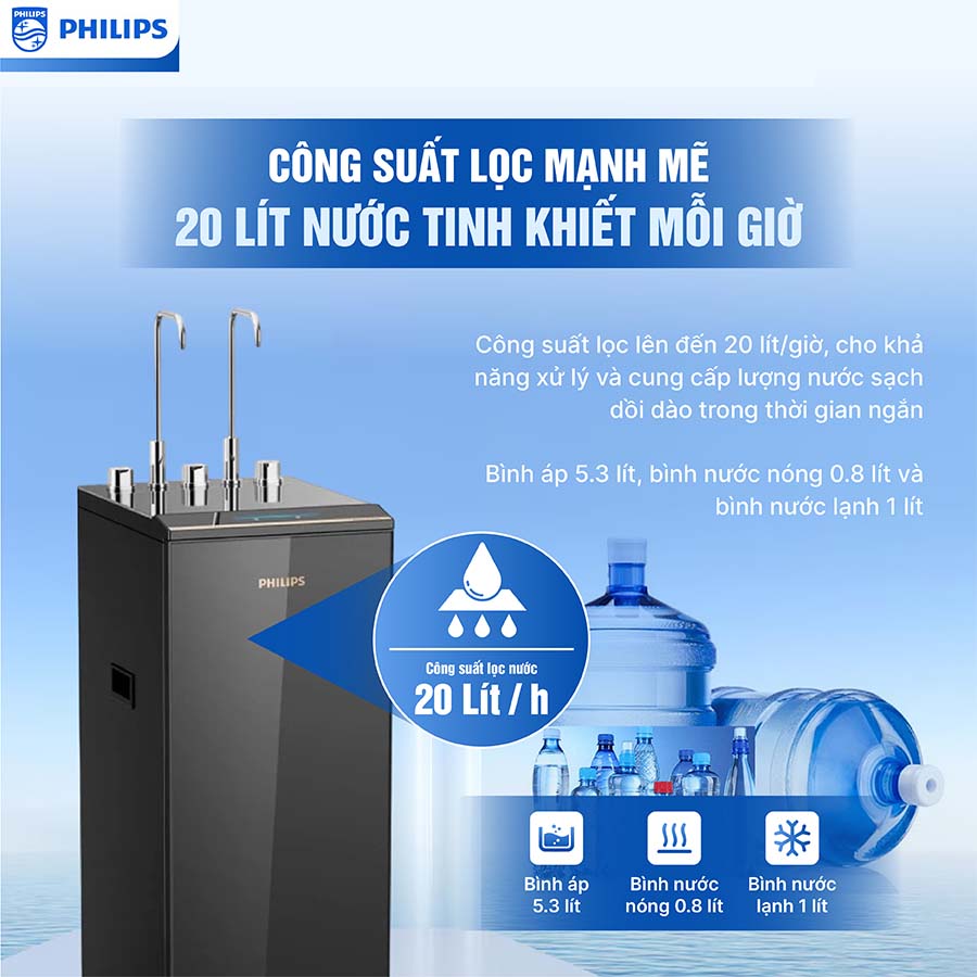 Công suất lọc mạnh mẽ 20 lít/giờ, đi kèm dung tích bình chứa lớn