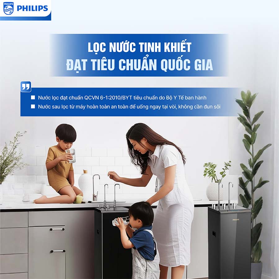 Philips ADD8922 tạo ra nguồn nước tinh khiết tuyệt đối, đáp ứng tiêu chuẩn quốc gia QCVN 6-1:2010/BYT tiêu chuẩn do Bộ Y Tế ban hành dành riêng cho nước uống đóng chai và nước uống trực tiếp. Đây là chứng nhận quan trọng khẳng định nước sau lọc từ máy hoàn toàn an toàn để uống ngay tại vòi, không cần đun sôi lại, phù hợp với mọi lứa tuổi, kể cả trẻ nhỏ và người cao tuổi.