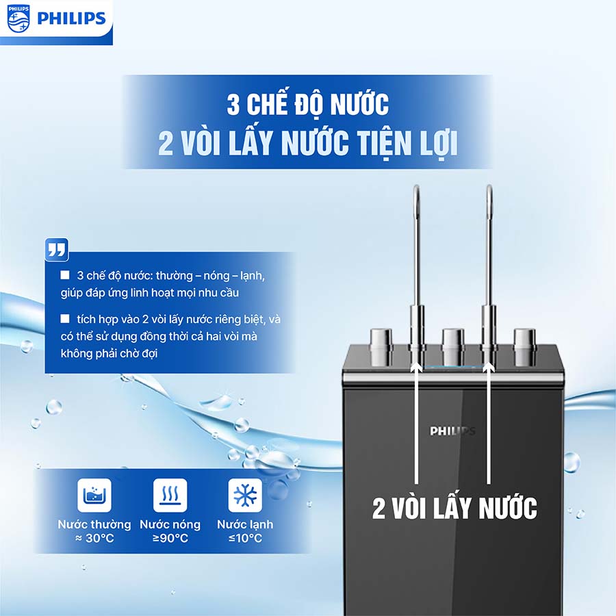 Máy lọc nước RO Philips ADD8922 không chỉ nổi bật với khả năng lọc nước tiên tiến mà còn được trang bị hệ thống cung cấp nước thông minh với 3 chế độ nước: thường – nóng – lạnh, giúp đáp ứng linh hoạt mọi nhu cầu sinh hoạt hàng ngày trong gia đình.