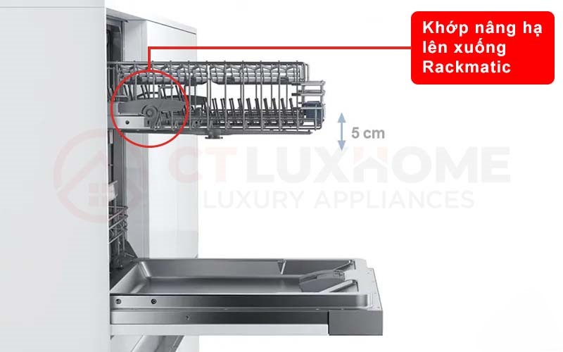 Máy rửa bát Bosch SMS6ZCI37Q thiết kế hệ thống giỏ đựng RackMatic® có thể điều chỉnh độ cao một cách linh hoạt. Thiết kế này cho phép bạn dễ dàng điều chỉnh độ cao của giàn rửa để có thể tối ưu không gian rửa. Nhờ đó có thể sắp xếp được các bát đĩa lớn, nồi chảo lớn một cách khoa học và hợp lý để đạt hiệu quả rửa sạch tốt nhất.