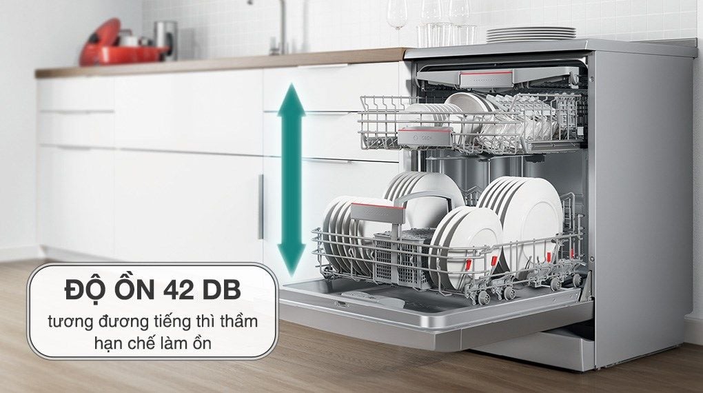Máy rửa bát Bosch SMS6ZCI37Q có độ ồn ở mức 42dB, được xem là mức độ ồn lý tưởng trên các sản phẩm máy rửa bát. Máy hoạt động khá êm ái, không gây tiếng ồn lớn ảnh hưởng đến không gian sinh hoạt và nghỉ ngơi của gia đình. Do đó bạn hoàn toàn có thể yên tâm rửa chén vào ban đêm mà không lo ảnh hưởng đến giấc ngủ của các thành viên.