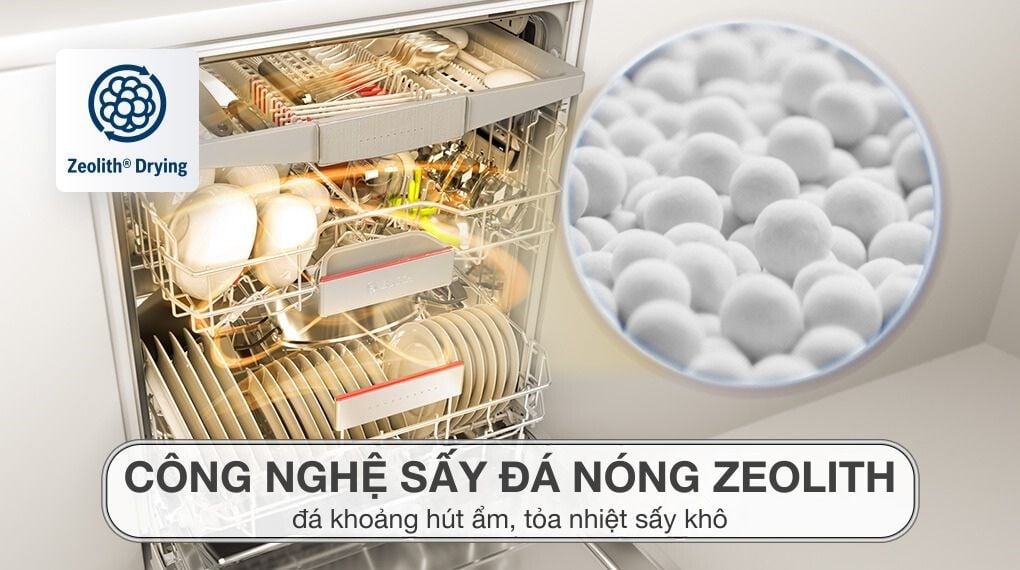 Đó là công nghệ sấy Zeolith – được đánh giá là một trong những công nghệ sấy tốt nhất hiện nay trên các sản phẩm máy rửa bát. Công nghệ này sử dụng các hạt Zeolith có khả năng hấp thụ hơi ẩm trong giai đoạn rửa và giải phóng chúng thành nhiệt lượng trong giai đoạn sấy. Luồng khí nóng sẽ được bơm vào khoang rửa, phân bổ đều khắp để làm khô bát đĩa một cách toàn diện. Đặc biệt, công nghệ sấy Zeolith còn cho hiệu quả tiết kiệm điện tối đa nên rất được người dùng đánh giá cao và ưa chuộng khi lựa chọn máy rửa bát cho gia đình.
