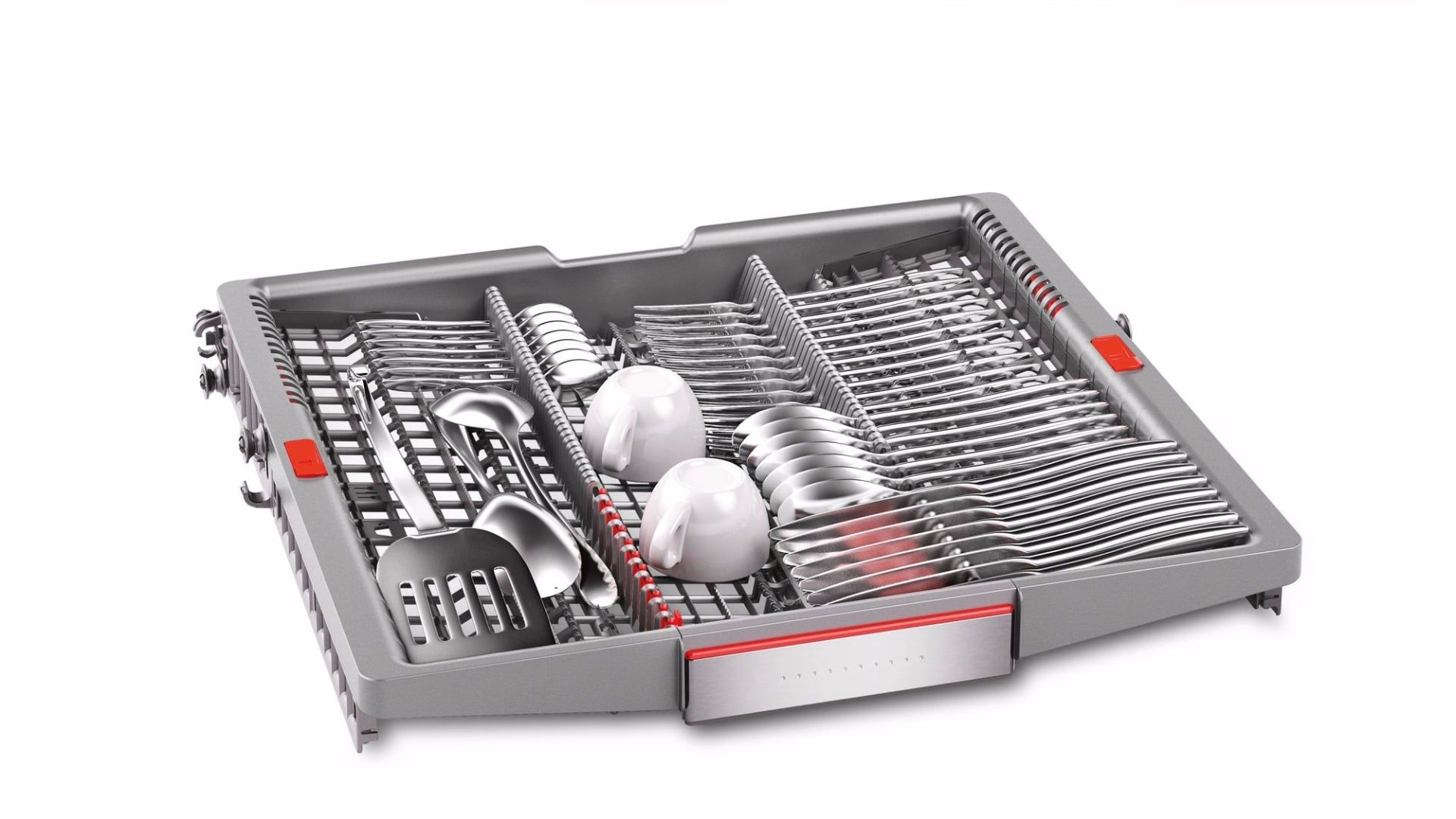 Giàn xếp dao kéo thứ 3 của Máy rửa bát độc lập BOSCH SMS88TI03E|Serie 8 cung cấp thêm không gian cho các dụng cụ dao kéo lớn. Các tấm bên cạnh là vị trí không gian cho các dụng cụ, cốc nhỏ - lên đến ly espresso. Nhờ các điểm tiếp xúc màu đỏ và các nút màu đỏ, cách điều chỉnh ngăn kéo linh hoạt cho dao kéo có vị trí của nó và xếp được nhiều hơn.