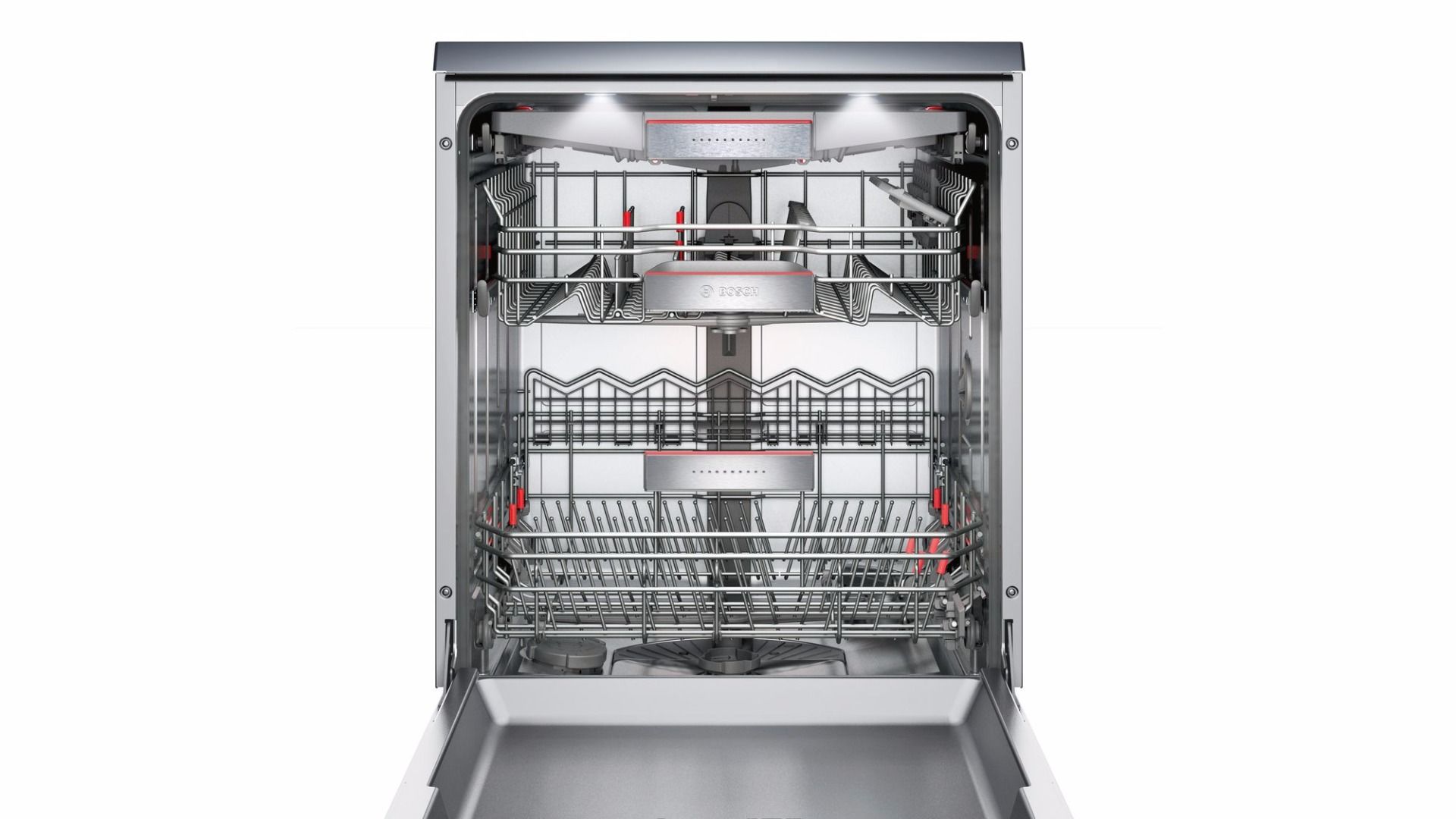 Máy rửa bát độc lập BOSCH SMS88TI03E|Serie 8 với hệ thống tay phun nước DuoPower - cánh tay phun kép trong giàn xếp trên tối ưu hóa tuần hoàn của nước đảm bảo kết quả rửa hoàn hảo. Hai cánh tay phun phía trên kết hợp với cánh tay phun phía dưới cải tiến việc phân phối nước, giúp đưa nước đến mọi ngóc ngách của khoang rửa. Ngoài việc làm sạch tốt hơn, tia nước chính xác cũng bảo vệ thủy tinh và gốm sứ cao cấp một cách tốt hơn.