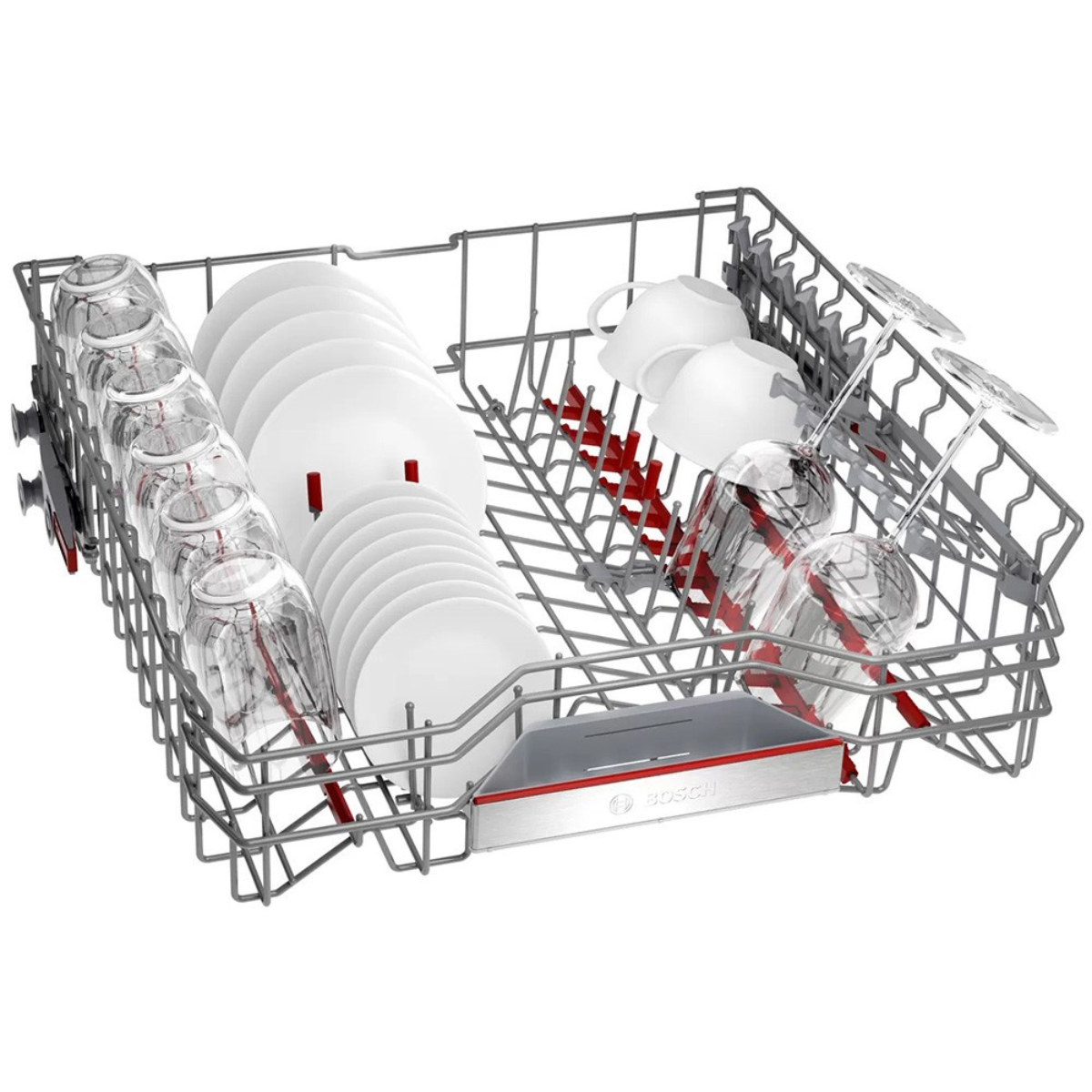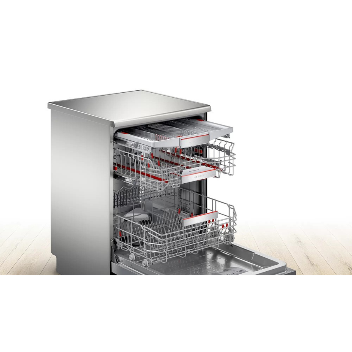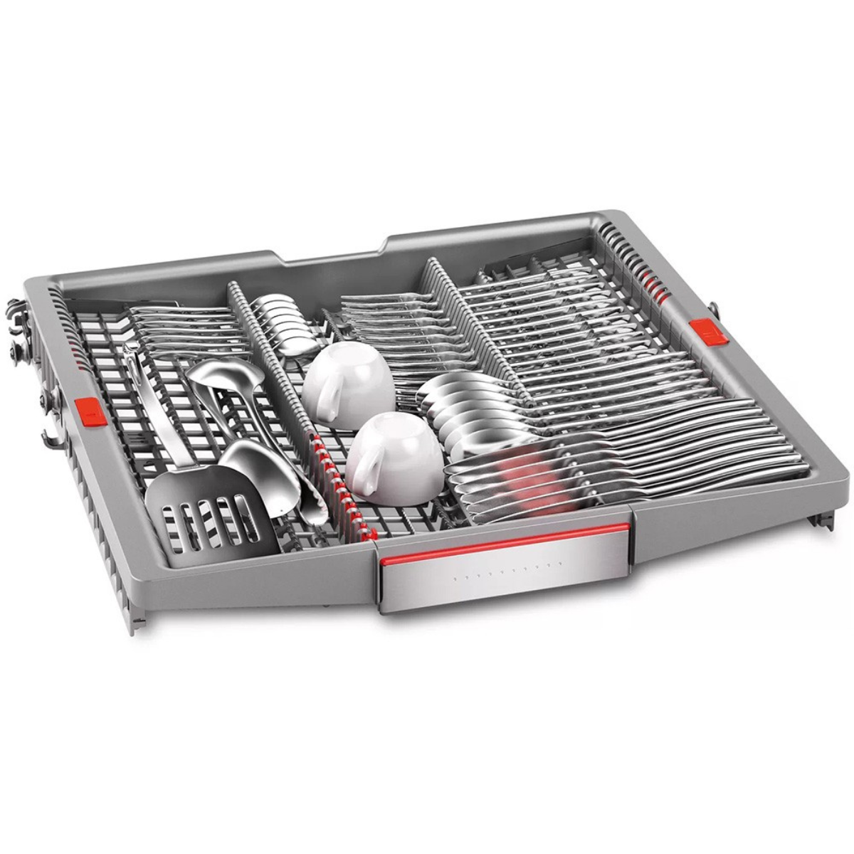VarioFlex Pro của Máy rửa bát độc lập BOSCH SMS8YCI01E|Serie 8 linh hoạt và sử dụng không gian tốt hơn. Thiết kế giàn VarioFlex Pro của Bosch có giàn thứ 3 riêng biệt để xếp dao, kéo, thìa hay dia của bạn một cách khoa học. Thiết kế mặt bên của giàn có thể hạ thấp được xuống để xếp cốc nhỏ, bát nhỏ. Các điểm tiếp xúc màu đỏ và các nút màu đỏ đánh dấu vị trí và cách điều chỉnh giàn linh hoạt với dao kéo được xếp. Với thiết kế như thế, nội thất của máy rửa bát trở nên khoa học và gọn gàng hơn.