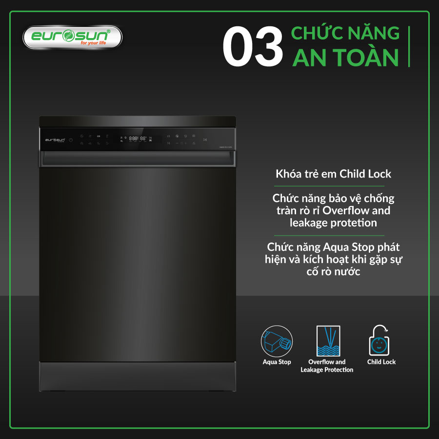 - Chức năng bảo vệ chống tràn, rò rỉ Overflow and leakage protection - Chức năng Aqua Stop phát hiện và kích hoạt khi gặp sự cố rò rỉ nước - Công nghệ UV Tech ngăn ngừa vi khuẩn sinh trưởng và tiêu diệt 100% vi khuẩn còn lại sau chu trình rửa |